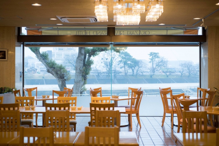 岡崎城を眺められるホテル客室又は乙川の景色を一望できるコーヒーラウンジ、