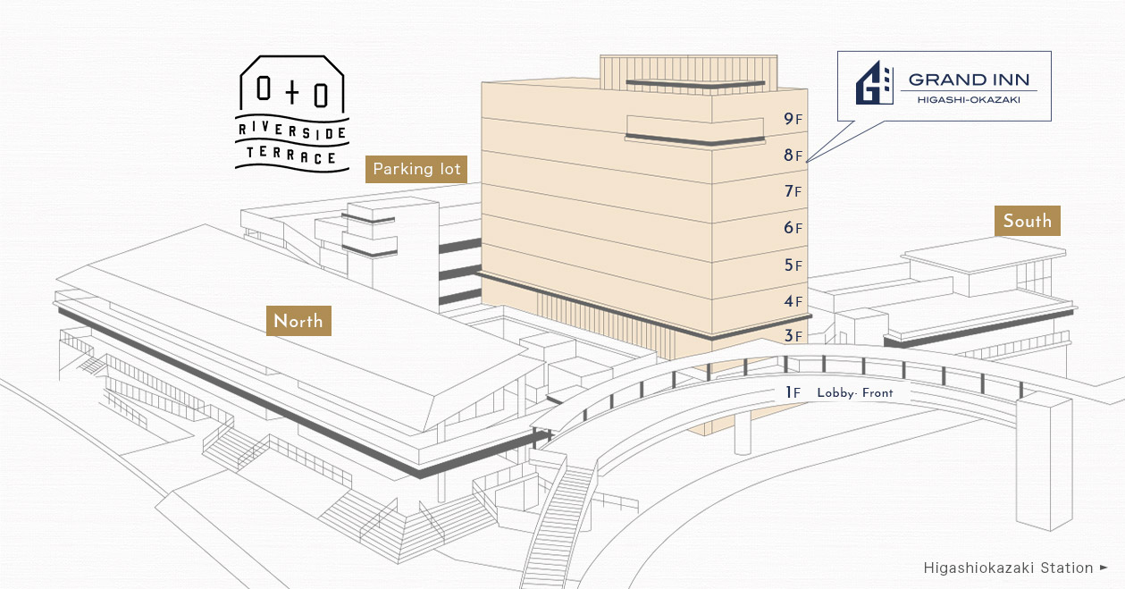 Grand inn Higashi-Okazaki is a hotel in the complex "OTO RIVERSIDE TERRASE" , which is directly accessible via the pedestrian deck.